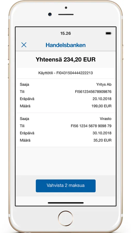 Vahvista-sovelluksella voit kirjautua Handelsbankenin mobiilipankkiin, verkkopankkiin ja yritysverkkopankkiin ja vahvistaa maksuja ja tapahtumia. Voit tunnistautua turvallisesti kolmansien osapuolien palveluihin, kuten esim. vero.fi tai kela.fi. Myös verkkokauppaostoksesi onnistuvat Vahvista-sovelluksella.