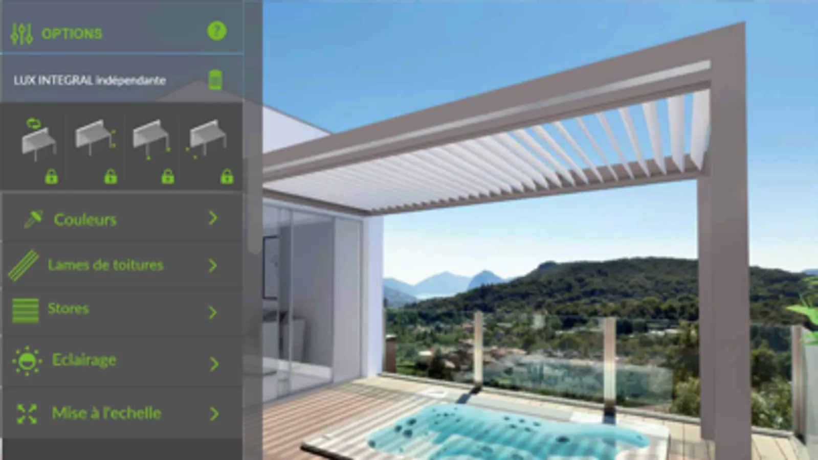 Cet outil innovant permet de réaliser des simulations d'intégration en réalité augmentée de pergolas bioclimatiques. Une large gamme de modèles; Design ou plus classique associés à un grand nombres d'options vous permettra d'intégrer votre pergola à votre habitation et de visualiser comme si la pergola était déjà en place. Parmi les nombreuses options vous trouverez; les stores, l'éclairage avec le mode jour/nuit, le bandeau "effet inox" ainsi que l'ouverture des lames. Une palette de plus de 300 coloris viendra finaliser votre projet qui pourra être photographié et sauvegardé dans la galerie d'images. Véritable simulateur 3D augmentée, il permet d'ouvrir et de fermer les lames de la toiture, les stores. Vous pouvez vous déplacer autour de votre projet sans que ce dernier ne bouge et ainsi d'avoir un véritable rendu de votre pergola dans l'environnement existant.