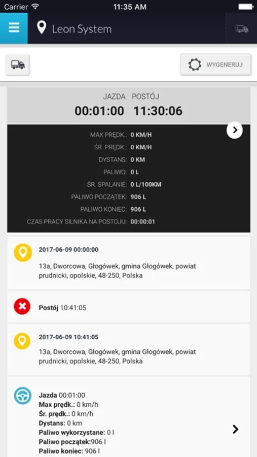 - aktualna pozycja wraz z statusem (postój, postój na włączonym zapłonie, jazda, przerwa itd.).