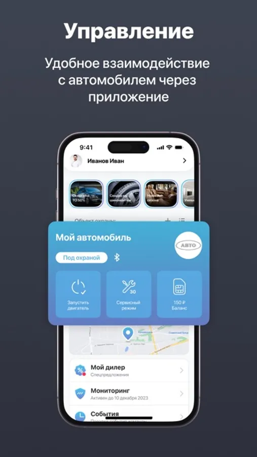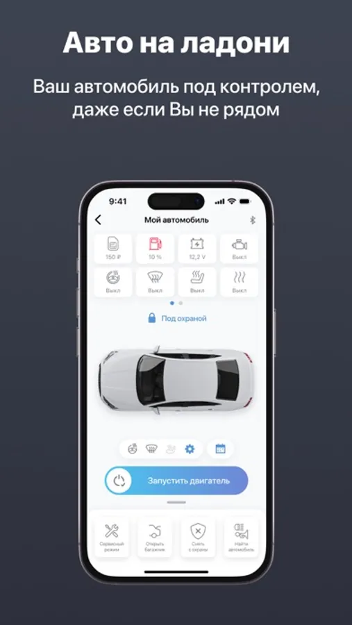 Дистанционное управление основными функциями автомобиля – запуск двигателя, постановка на охрану и снятие, открытие багажника, включение фар и многое другое. Все параметры машины удобно и понятно выводятся в приложении – уровень топлива, заряд аккумулятора, пробег и другие. Есть возможность настроить календарь включение автозапуска для прогрева/охлаждения автомобиля.