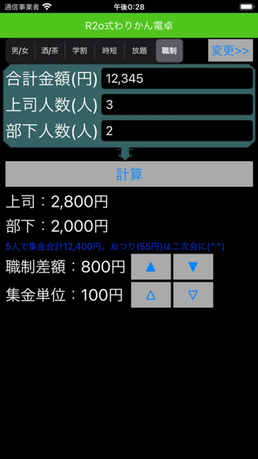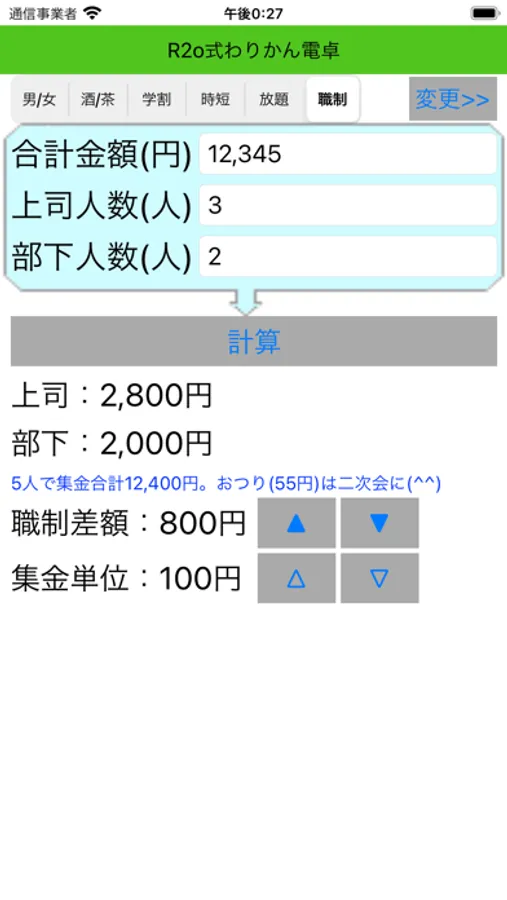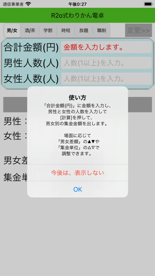 合計金額と男女の人数を入力して「計算」ボタンをクリックするだけで、適切な男女別の集金金額を算出します。
