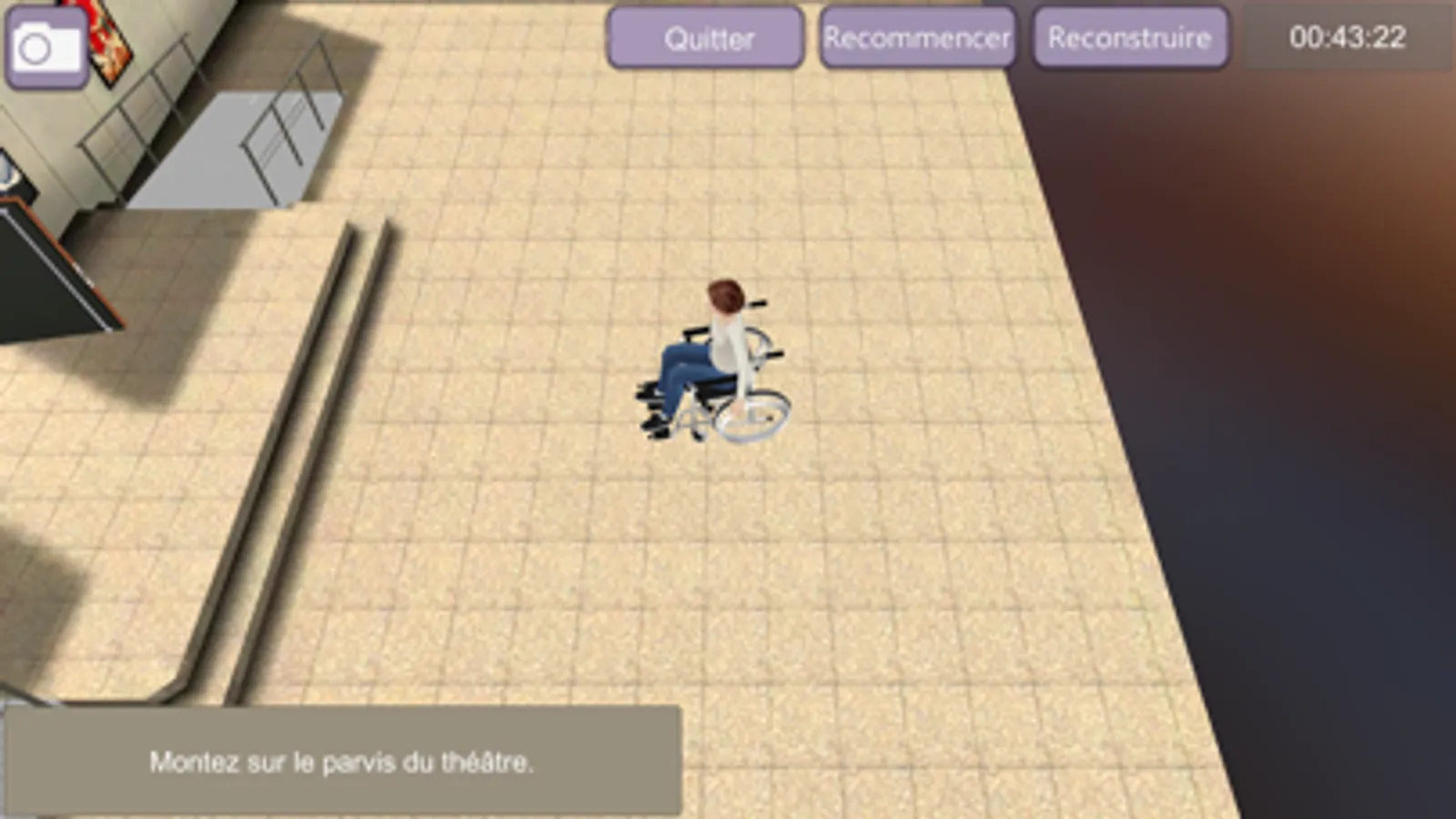 Vous devez installer les fauteuils, les portes, les sorties de secours... aux bons endroits pour accueillir le public. Une fois les installations terminées, vous pouvez simuler l’utilisation des aménagements, les modifier puis valider la conformité.