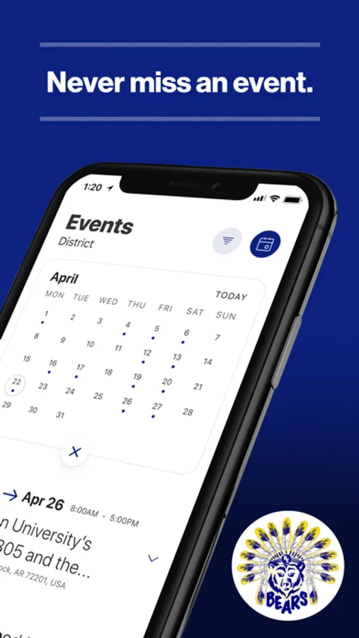 The event section shows a list of events throughout the district. Users can add an event to your calendar to share the event with friends and family with one tap.