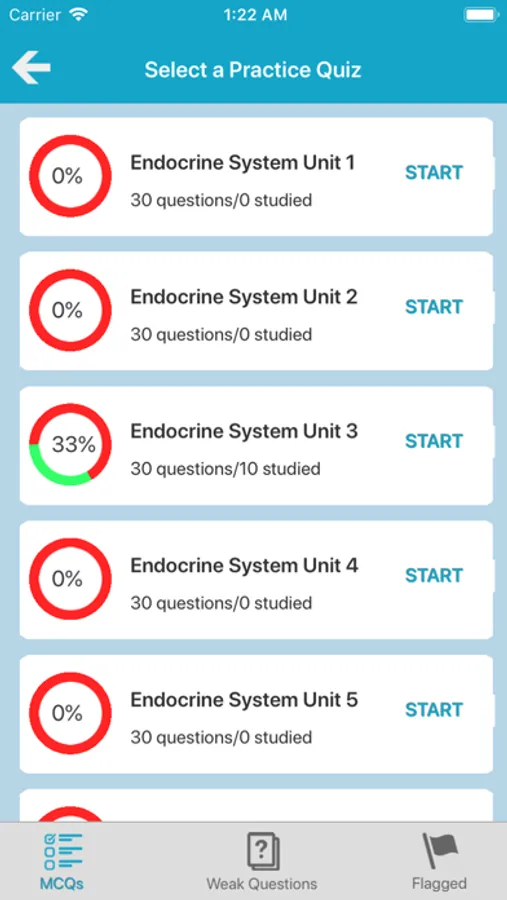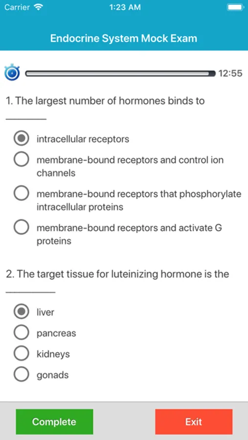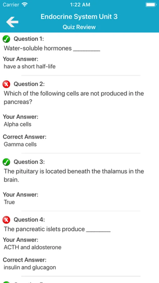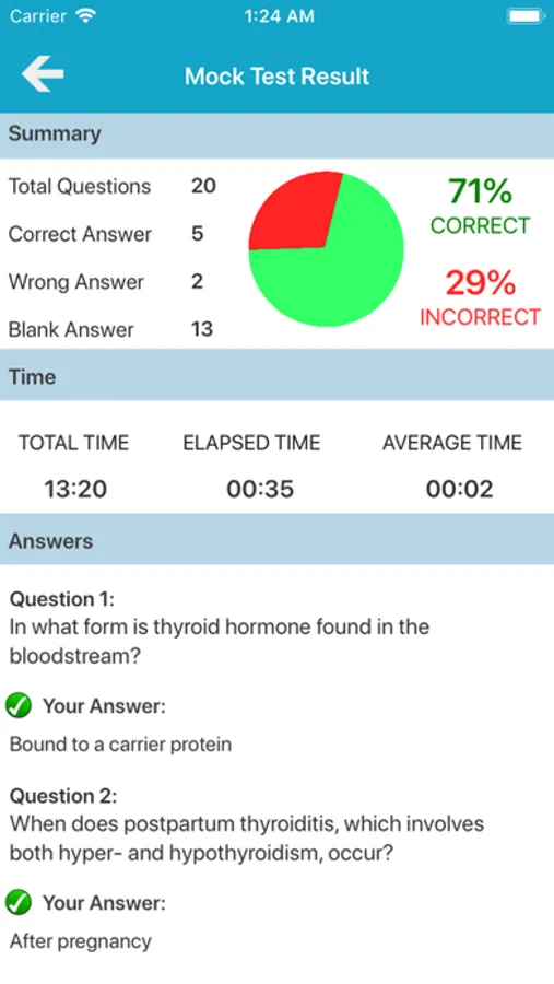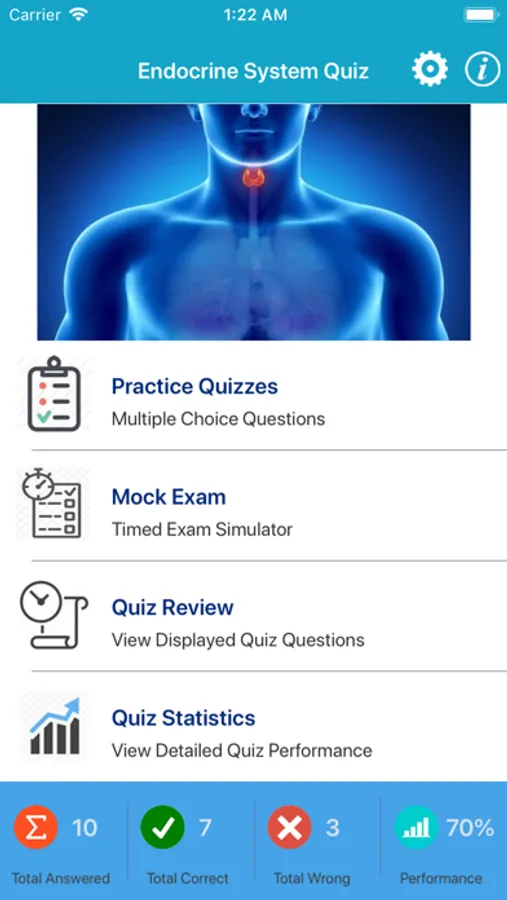 Other quiz mode is Mock Test that questions randomized each time of all topics of the endocrine system.