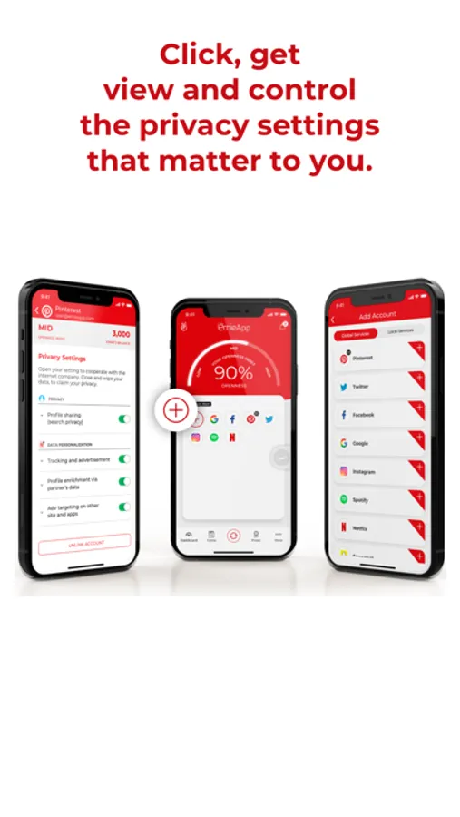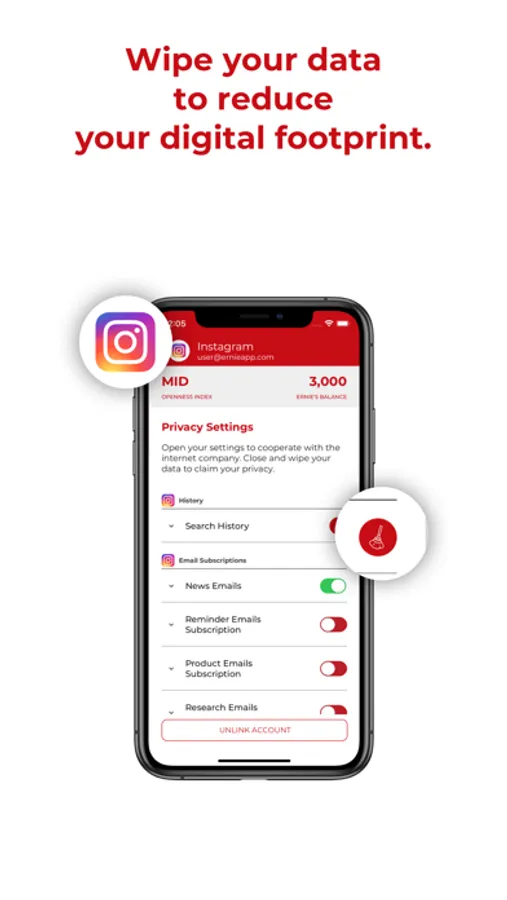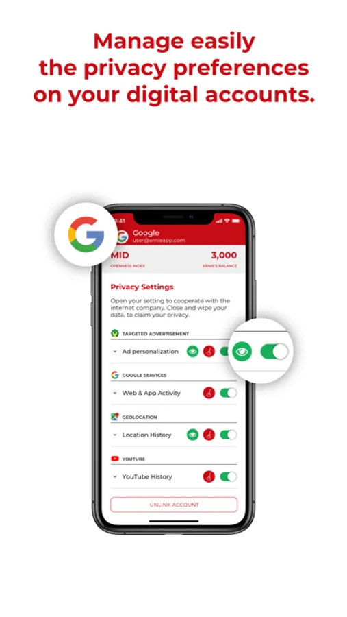 Use the SWITCH to enable/disable data sharing. Action the BROOM to delete data you want deleted. Click on the EYE to discover how your data are monetized by the platform. Check the Index to monitor your privacy score. Play the GAME to learn more about your digital. Refer the app to accrue ERNIES.
