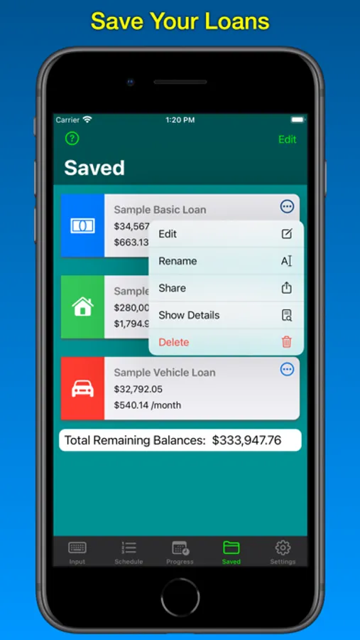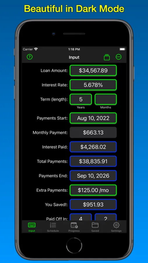 Loan2Me is a free loan calculator that provides a quick and easy way to calculate your loan payments by entering the loan amount, interest rate and term (length of the loan). Pro features gives you additional input screens and date features to easily calculate any loan value. Do you want to know how much loan you can afford? Easy, enter the monthly payment you want to make, how long you want to pay and the interest rate to calculate the loan amount. Do you want to know how a lower interest rate effects your monthly payment? Or how about shortening the term of your loan? How much will you save in interest? What if I pay more than the required monthly payment? All these answers are easily calculated with the user friendly input screens. Calculate your loan amount, Equated Monthly Installment (EMI), principal, interest, taxes and insurance (PITI) payment per month, Private Mortgage Insurance (PMI), total interest paid, total payments and more. For mortgage or vehicle loans, use the easy to fill-in input screens for down payments, trade-ins, dealer incentives, insurance, property taxes, sales tax and more. Save your loans by tapping the ellipsis (more actions) button in the input or edit screens, then select ’Save’ from the context menu (requires Pro Features). Your saved loans will automatically sync across all devices through iCloud (requires iOS 13 or later). Tap on your saved loan to view details and current progress on your loan. Customize the arrangement, rename, edit, share or delete your saved loans with a few taps. The detailed amortization schedule shows how much of your monthly payment goes towards interest and principal along with the remaining balance. Create detailed Portable Document Format (PDF) reports you can markup, save and share with just a few taps. Quickly alter the loan input values to see the effects on your payments, total interest, total payments and term. Add extra payments to see how much time and money you can save by adding a little more each month. Use the slider on the Progress Chart to visualize your loan progress over time. How much will I still owe after 5 years? See how much you actually paid and how much you still owe after a specified amount of time. Share, save or print your results with just a few taps. Is it better to take the cash back or a lower interest rate? How much will I save with a 20-year mortgage over a 30-year mortgage? A valuable tool for anyone wanting instant answers to make an informed decision on that next loan. With vehicle loans, you can also customize the sales tax calculation for your state on whether they give a tax credit for trade-in value and/or dealer incentives. Great for calculating mortgages, car loans, personal loans, boat loans, recreational vehicle (RV) loans, student loans, etc. Knowledge is power. Be an informed buyer to get the loan you want and negotiate the lowest price. Loan2Me incorporates accessibility features of VoiceOver and Dynamic Font size for user preferences. Now you can choose between five different color themes. Looks great in both light and dark modes! Detailed help screens and Frequently Asked Questions (FAQs) provides an abundance of information so you can utilize all the features available in this app. The best part is the basic features are FREE without any annoying ads! Don’t miss out on the Professional Features that are available for a one-time purchase. Add this fantastic tool to your toolbox and you’ll always be ready for that next big purchase!