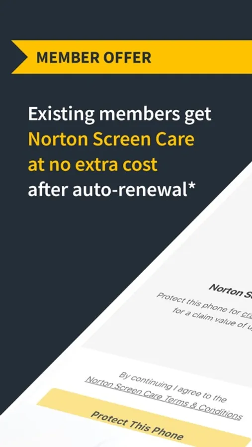 • For Norton Screen Care, as long as you are enrolled in a qualifying auto-renewing subscription, the Protection Plan is provided at no cost to you for a single device and protects against one covered Failure during the term of your subscription. This loyalty offer may be changed or removed at any time.