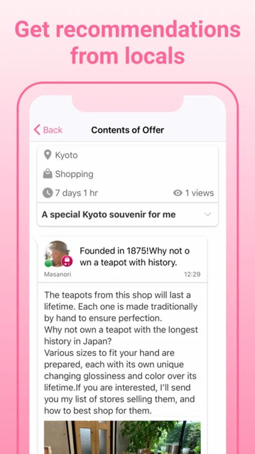 Local people in each area of Japan become helpers, offering recommendations to you based on your personal requests.