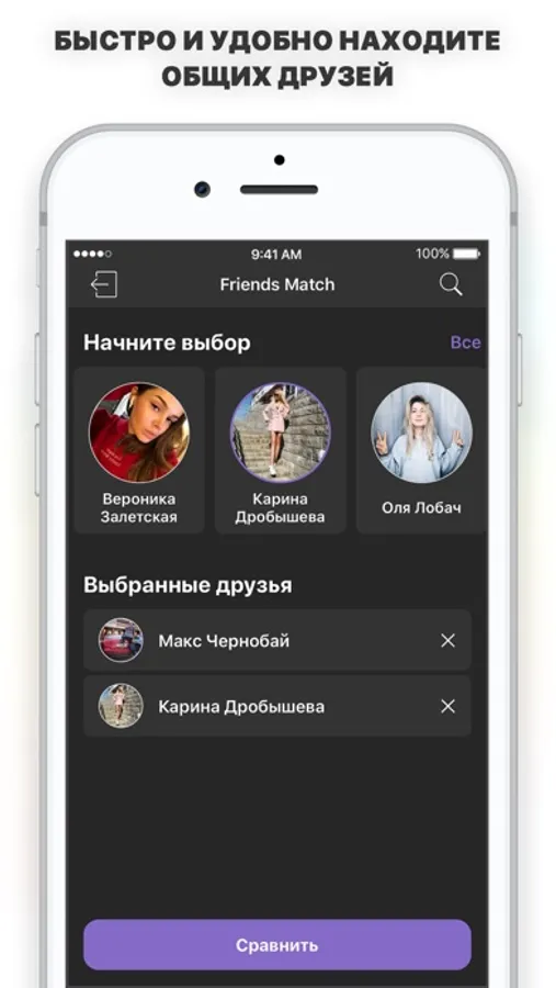 VK Match позволяет вам узнать общих друзей между двумя людьми. Смотри сколько общих друзей у твоего друга и любимого кумира. Легко узнать с кем поддерживают контакт твои друзья!
