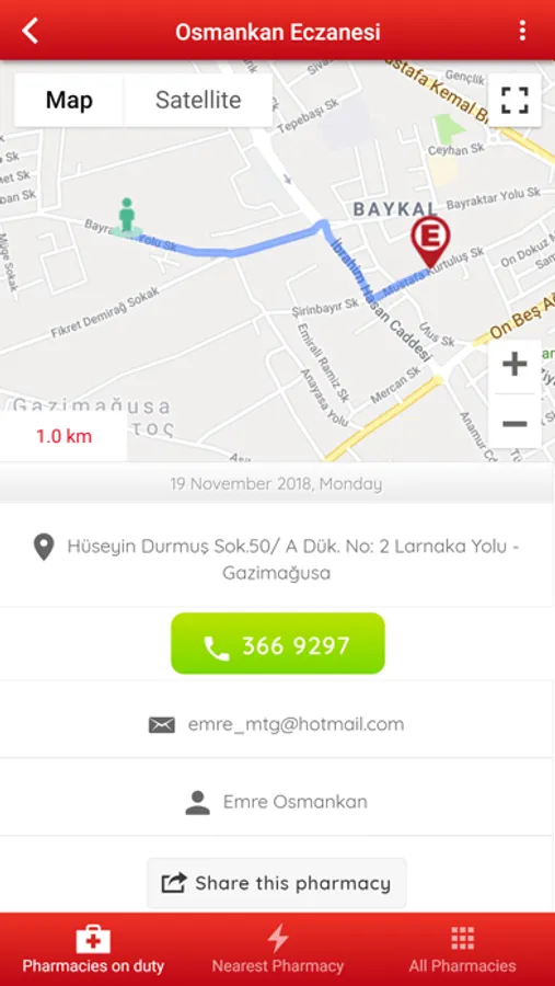 You can find the name, address, location, email and the phone number of the pharmacies. If you need to contact the pharmacy, you can call by just a simple tap on the phone number.