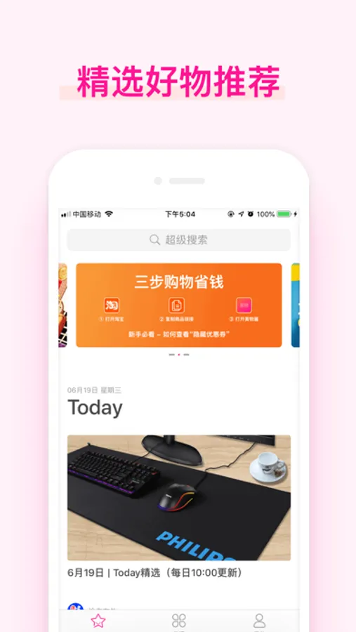 「美物酱」App每天会推荐一些非常优质的,又很优惠的商品,在Today版块中推荐。另外,在发现中也会根据您在淘宝购物的喜欢,推荐一些您可能喜欢的商品。