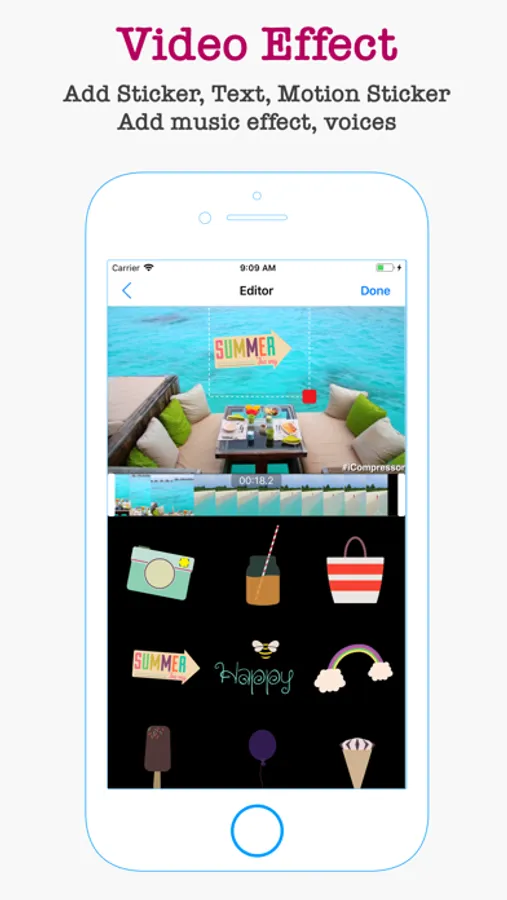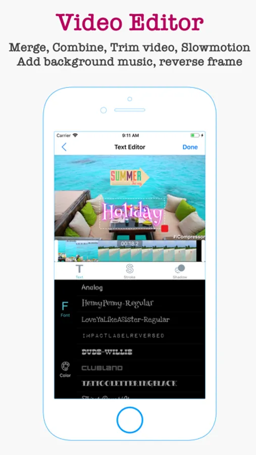 • Video Editor (Ex: Merge, Crop, Split, Add audio, add sticker...).
