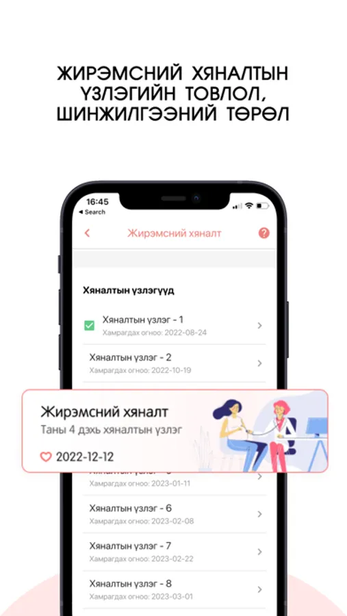 Жирэмсний хяналт- Таны жирэмсний хяналтын хугацаат үзлэг, зайлшгүй өгөх шинжилгээний дэлгэрэнгүй мэдээллийг багтаасан
