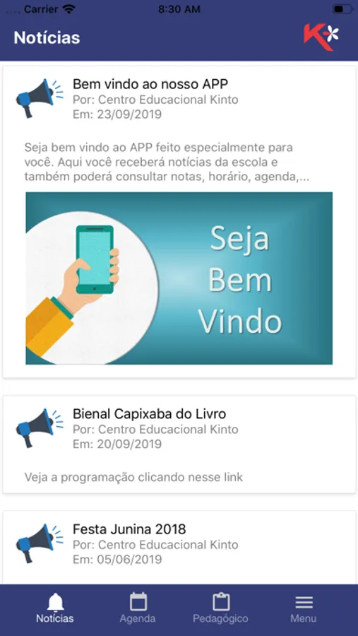 App para as escolas que usam o sistema de gestão escolar Kinto. Permite consultas ao boletim, mensalidades, horário escolar, acompanhamentos disciplinares, além de possuir agenda escolar e painel de notícias para uma eficiente comunicação entre a escola, alunos e responsáveis.