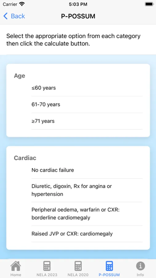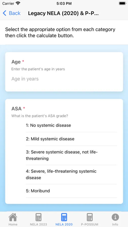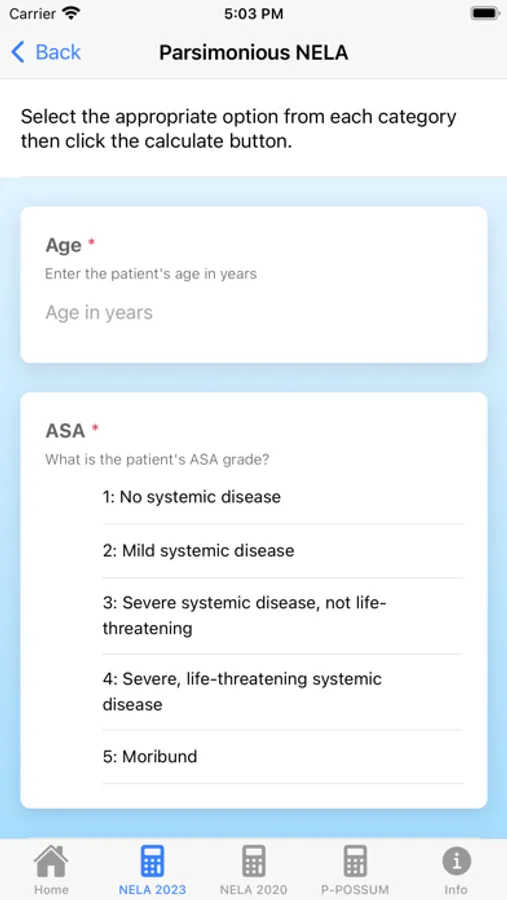 This calculator enables clinicians to enter clinical data and generate risk estimations based on the Parsimonious NELA (the National Emergency Laparotomy Audit) risk calculator, a widely used scoring tools used to risk assess patients for emergency laparotomy.