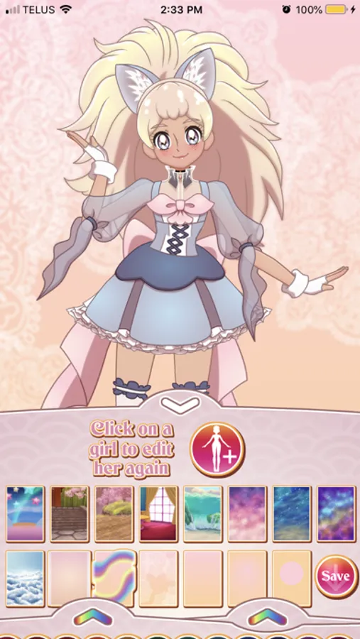 Dress up your kawaii ladies in Japanese lolita inspired fashions. Decorate with bows, jewelry and even drag and drop glitter! Add animal ears and tails to create neko characters, like catgirls or foxes. At the end, add MORE characters to your scene to put together a powerful force of magical warriors!
