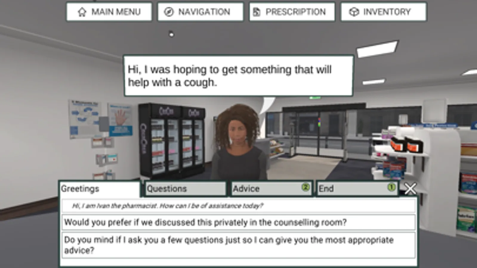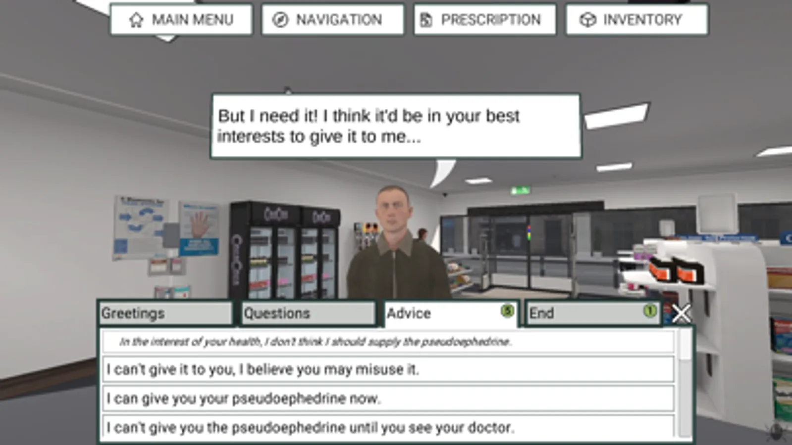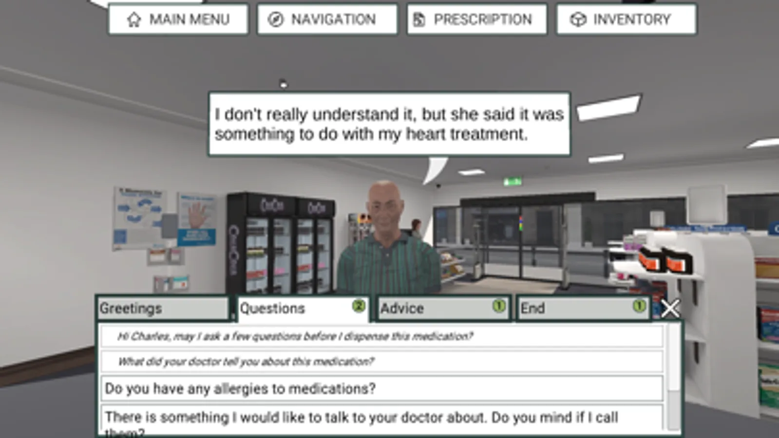 Pharmacy Simulator is a complete solution for training both students and professionals in all fields of pharmacy practice. Interact with patients, dispense medication, consult with prescribers, nurses and other health professionals, defuse challenging situations, and more, across a wide range of scenarios written by experts in the field.