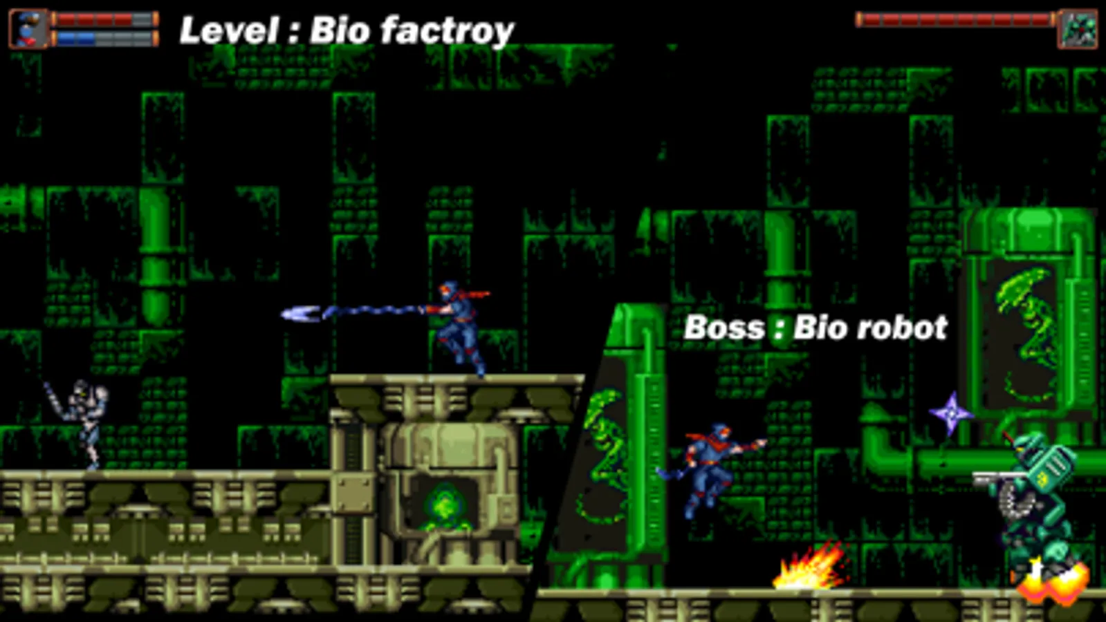 Every soldier and Boss in the level, this is left to the player to explore. Come on, pick up the samurai sword and start your ninja trial. When you master every weapon and ninjutsu, you become a real master ninja!