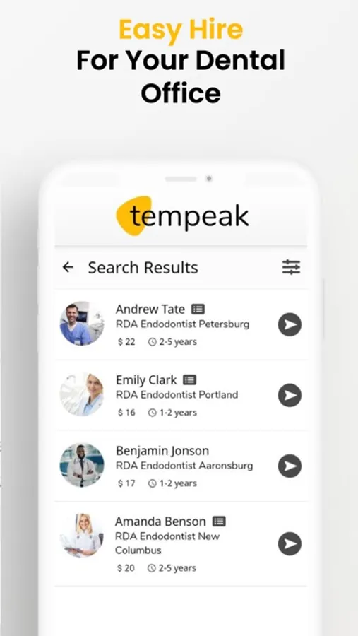 Welcome to TEMPEAK, a temporary and permanent staffing placement company that is provided to you by SemereyDentalManagement,LLC. TEMPEAK provides a simple solution to staffing issues for Dental community all over United States. It directly connects the employee to an employer in a matter of minutes. While using TEMPEAK, you will discover how easy and fast you can gain access to thousands of available licensed dental professionals in a matter of seconds. No more calling the traditional staffing agency!
