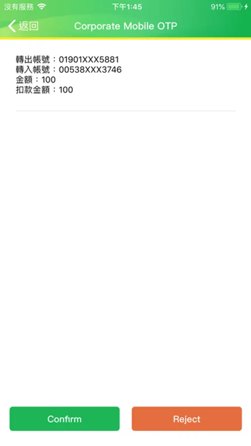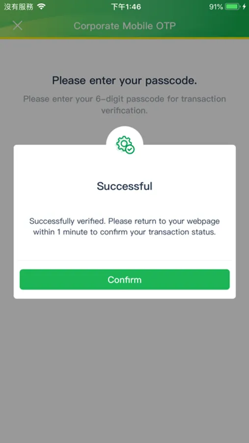 When no network is available, you can still log in to the corporate mobile passcode App. Enter your preset personalized six-digit corporate mobile password and select "Offline authentication" to generate an OTP in offline mode and release transaction successfully.