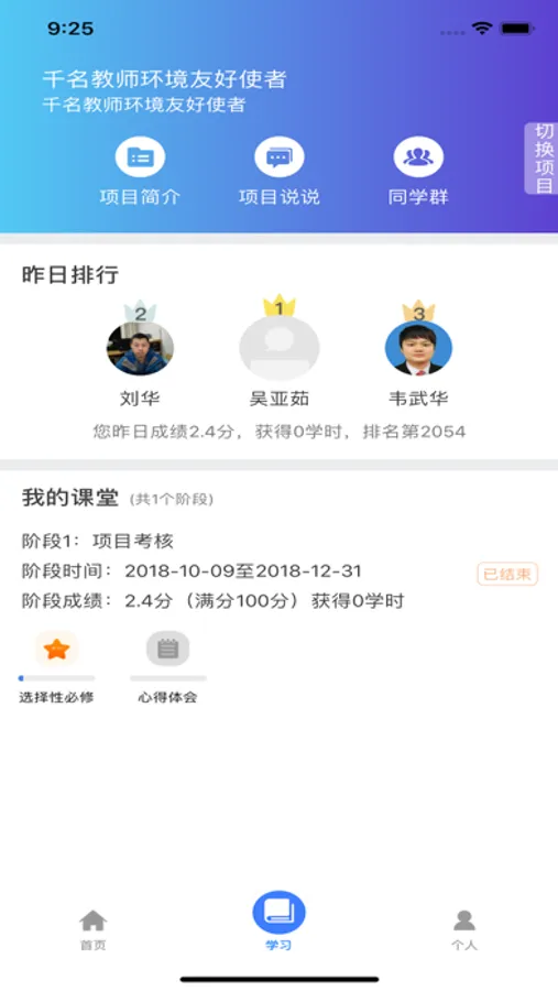 个人:查看个人信息,修改个人头像,绑定课程卡/学习卡,查看个人参加的课程、培训项目、设置相关信息;