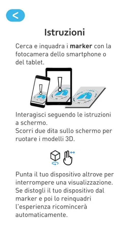 L’iter tecnologico di user experience è molto semplice: dopo aver scaricato l’App e i relativi marker (questi possono essere visualizzati su schermo PC, smartphone, tablet o carta stampata), basterà aprire l’App, seguire le istruzioni presenti nel tutorial iniziale, e inquadrare il marker. Una volta apparso il modello digitale sarà possibile visionare le loro animazioni e descrizioni relative.