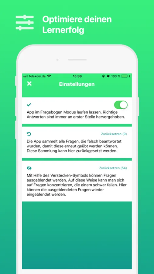 - Falsch beantwortete Fragen werden gespeichert und können jeder Zeit wiederholt werden.