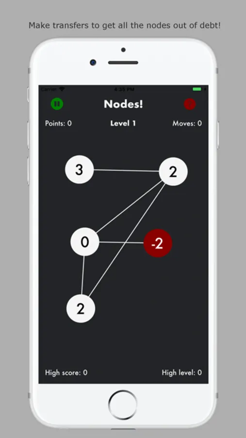 Some of the nodes on the board are negative. To proceed to the next level, you must get all of the nodes out of debt. Do this by transferring money from one node to all connected nodes. But beware: transfer too much from a single node and it'll go negative as well!