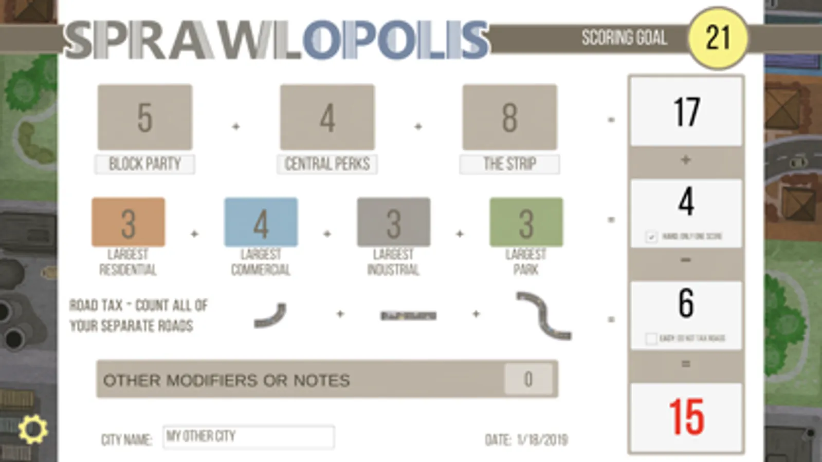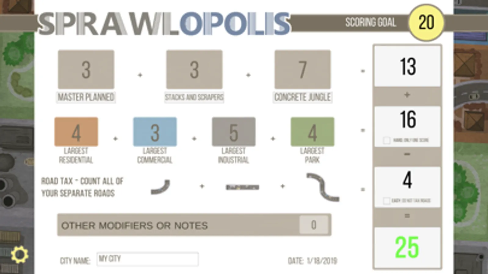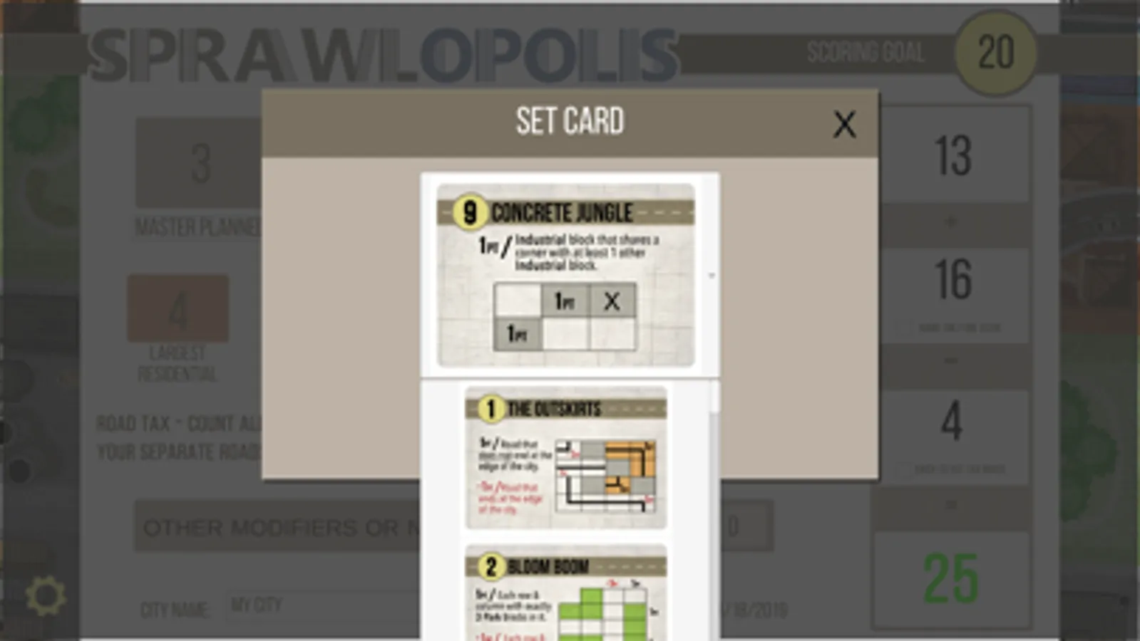 Sprawlopolis is a 1-4 player city building game from Button Shy Games. With 3 variable scoring goals, as well as road taxes and common block scoring, we've made Score Tracker for you to calculate, save, and share your scores. Choose your three cards and start the game. Come back and tally your score at the end.