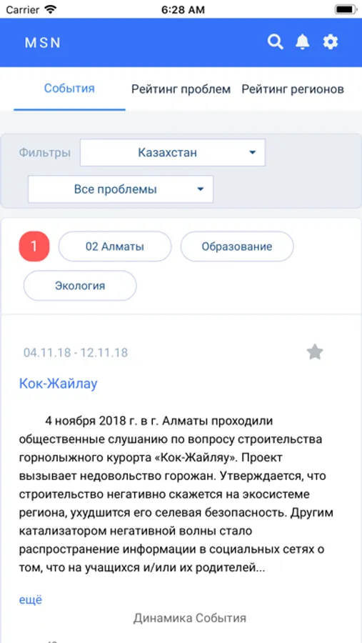 Просмотр событий в Казахстане в виде карточек, ранжированных по степени напряженности. Включает в себя недовольства пользователей по событию из социальных сетей. Аналитическая записка по событию написанная экспертами прикрепляется к событию и предлагает профессиональный анализ ситуации. График “Динамика Событий ” позволяет ознакомится с развитием и популярностью события на протяжении промежутка времени. Отслеживает события в разрезе Регионов РК и в разрезе различных сфер проблематики (Безопасность, Транспорт, Здравоохранение, ЖКХ, Образование и пр.).
