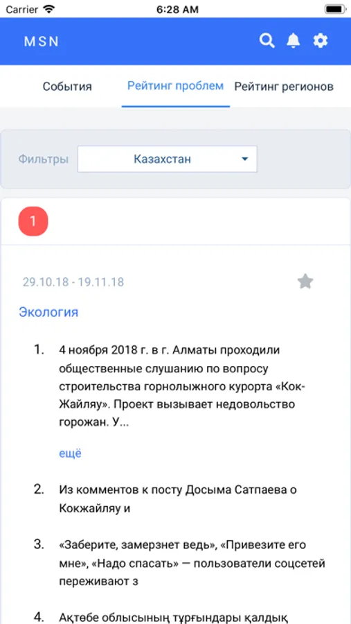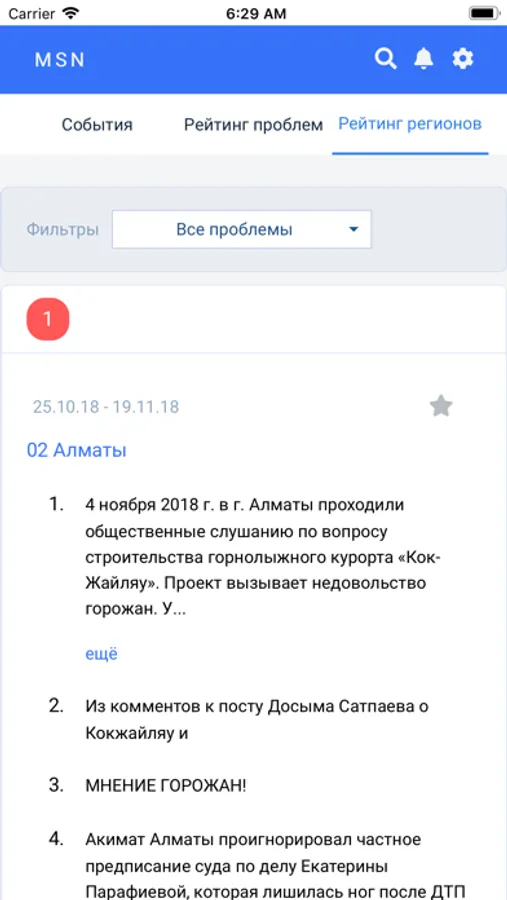 Просмотр проблемных регионов в Казахстане в виде карточек ранжированных по степени напряженности. Включает в себя аналитические записки, графики “Динамика событий” и недовольства пользователей из социальных сетей. Фильтр по проблемам позволяет выбрать определенную проблему и ознакомится с проблемными регионами ранжированными по степени напряженности.