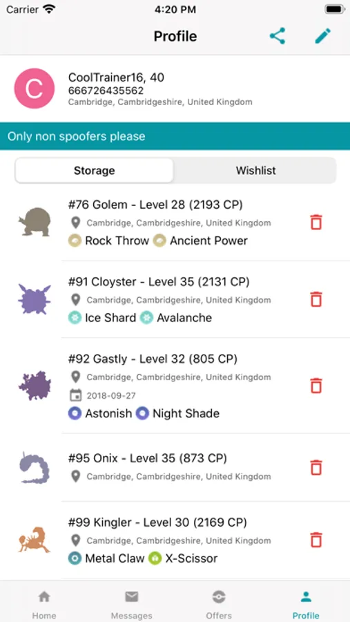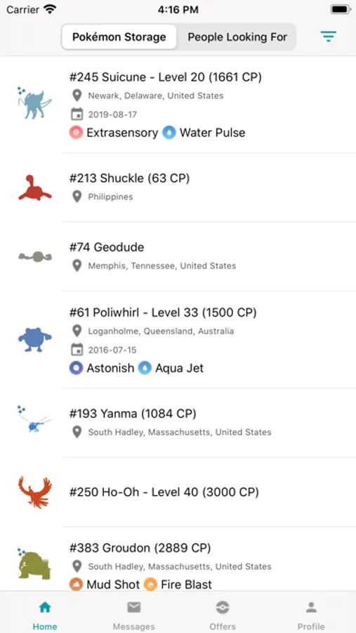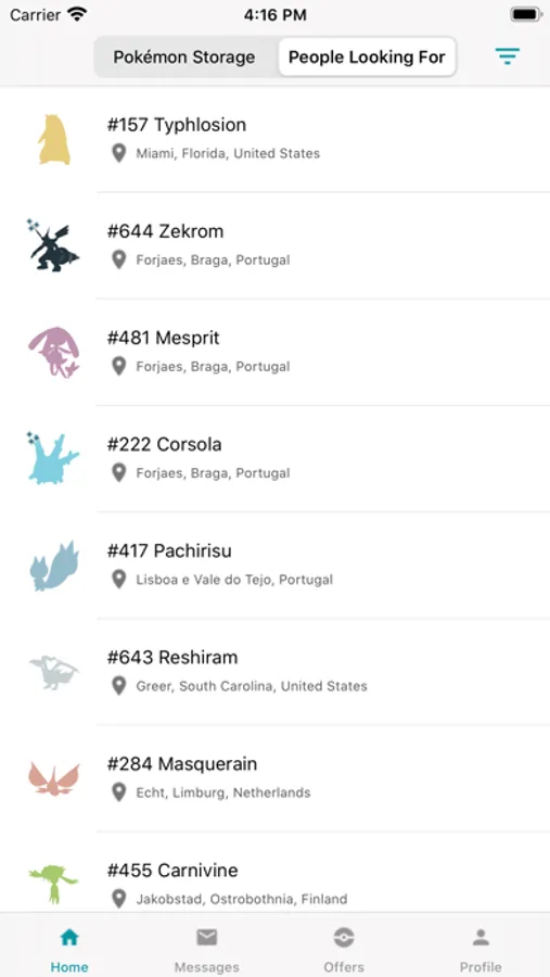 You may search through other travelers' Storage and Wishlist by location name, level and moveset.