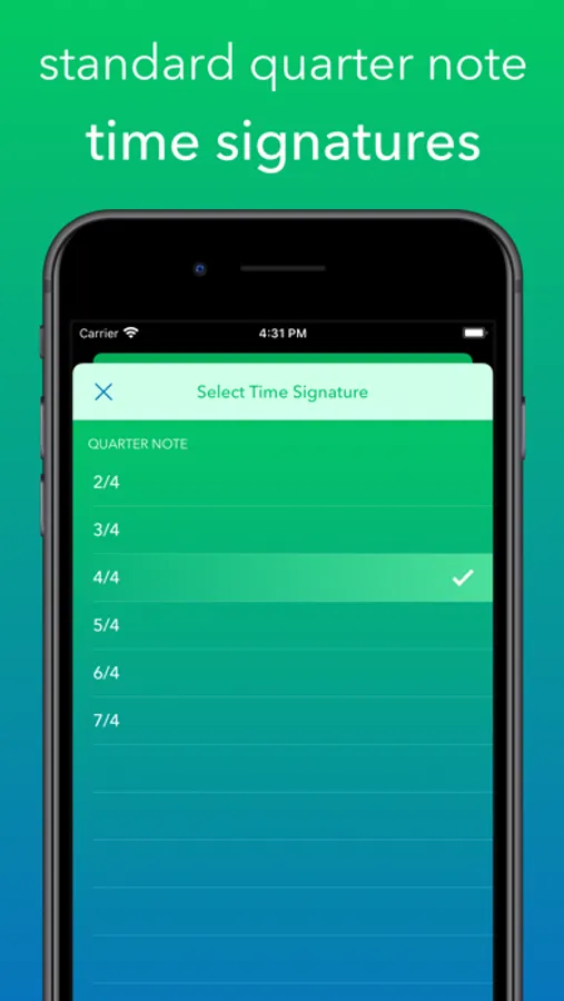 • Standard quarter-note time signatures: 2/4, 3/4, 4/4, 5/4, 6/4, 7/4