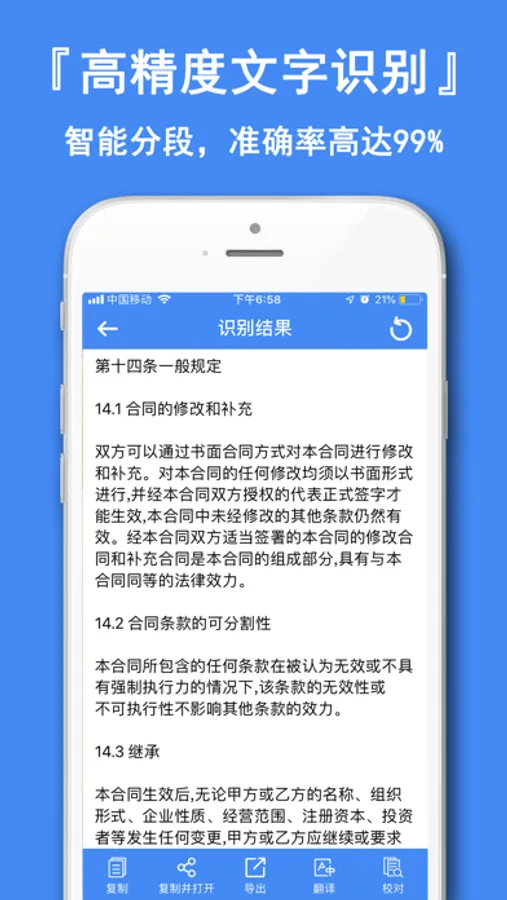 便捷分享:识别结果可编辑且选择复制到各种app中使用,支持微信、QQ、微博、邮件等。