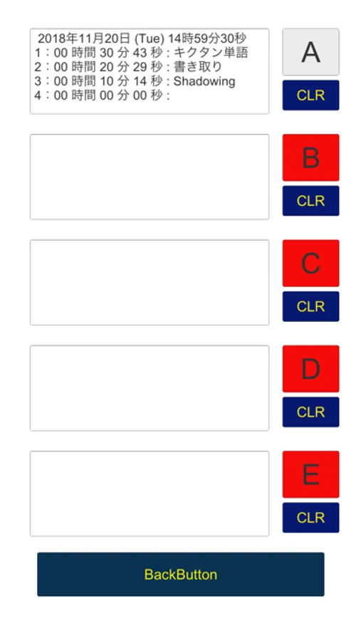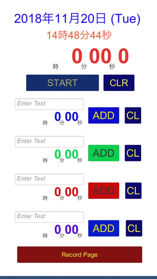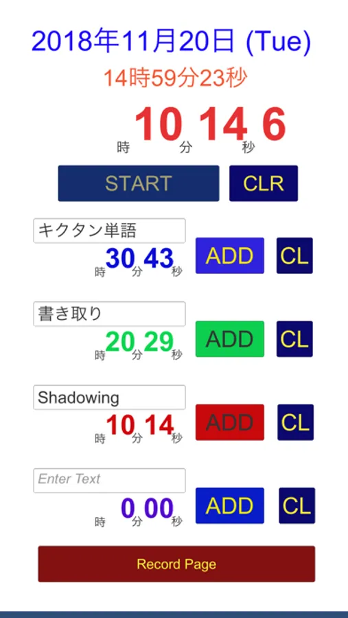 タイマーは、「START」ボタンを押すことによってスタートし、再度押すと「PAUSE」になります。ボタン表示が「PAUSE」の時に、4つある各項目の「ADD」ボタンを押すとタイマーの数値が記録されます。