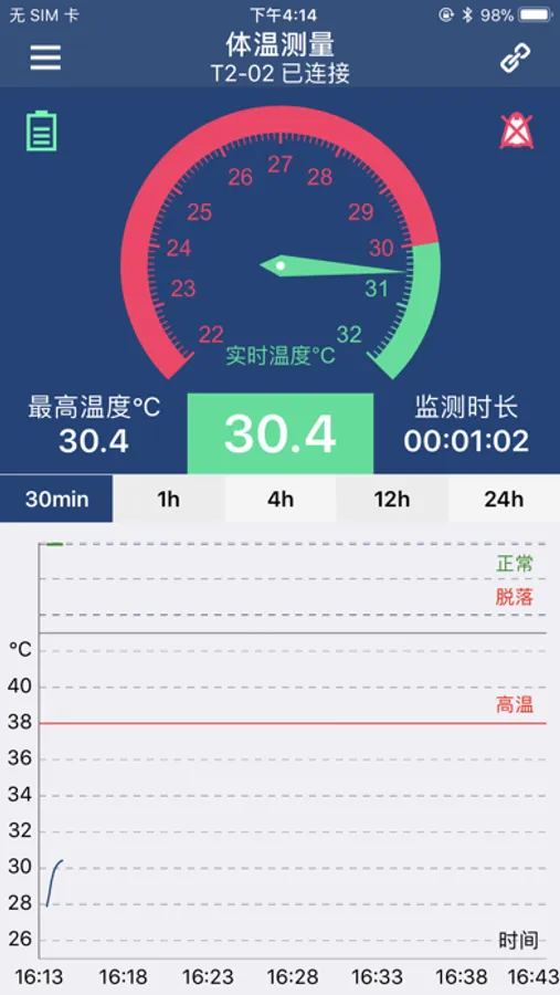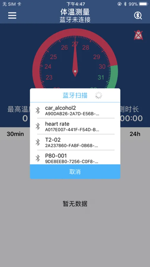 此app用于获取无线体温计TemperEasy的数据,TemperEasy通过蓝牙将数据发送给app,app将数据画成曲线展示给用户,达到便捷测量人体体温的效果。