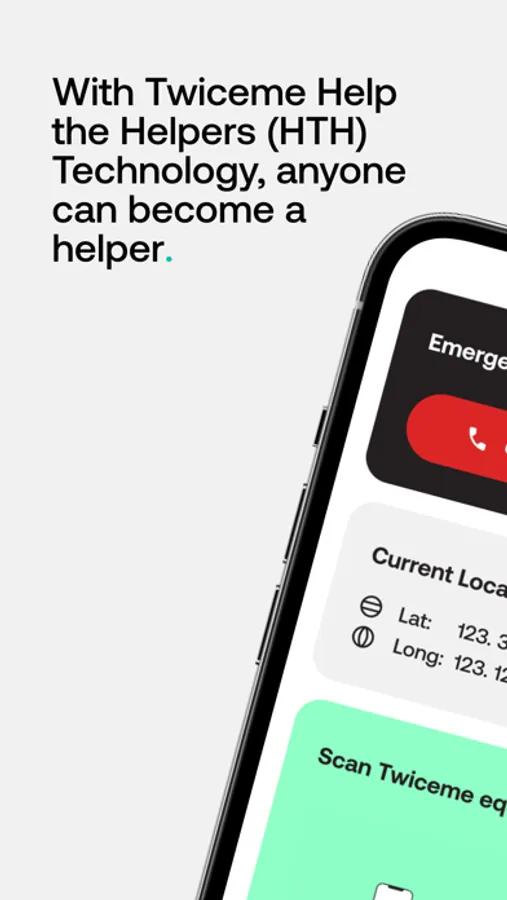 Twiceme Help the Helpers (HTH) technology gives bystanders the information they need to help someone who has become incapacitated in an accident. Tap the Twiceme symbol with a smartphone to alert, relay location, and access critical information uploaded by the wearer.