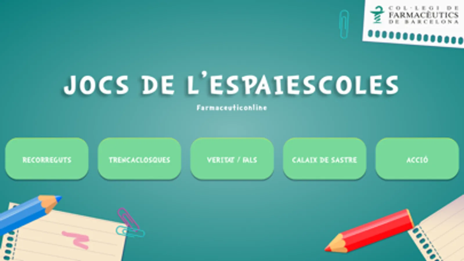 El web Espai Escoles del Col·legi de Farmacèutics de Barcelona ofereix a les escoles continguts sobre salut per treballar a l’aula. Entre aquests continguts hi ha una selecció de jocs per tal que els nens i les nenes aprenguin sobre la importancia de la prevenció en salut.