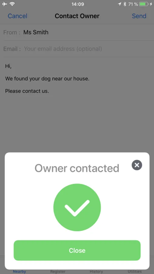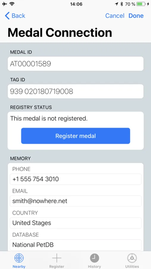 • Specify veterinary name and contact information to the carrier of a medal and these information will be shown to any user detecting its medal in range or doing a search on it