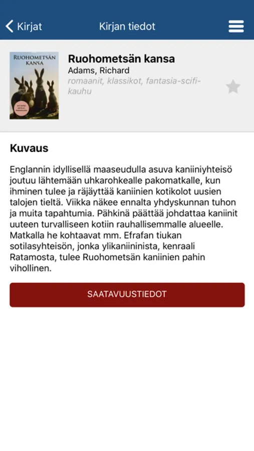 Kirjan esittelysivulta pääset PIKI-verkkokirjastoon, jossa voit tarkastaa kirjan saatavuuden PIKI-kirjastoissa ja halutessasi varata sen. Verkkokirjastosta pääset myös e-kirjapalveluun, jossa e-kirjoja lainataan ja varataan.