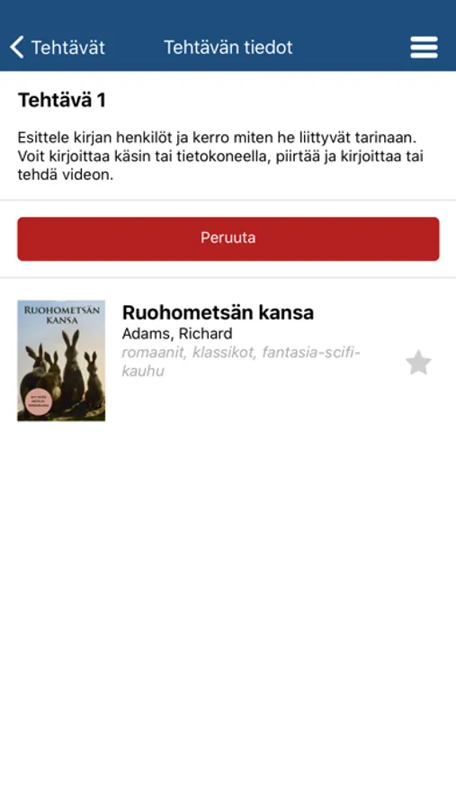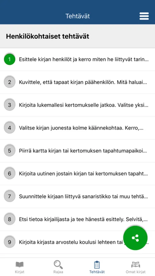 Voit ylläpitää muistilistaa tehdyistä tehtävistä ja niihin valituista kirjoista. Voit tallentaa muistilistan laitteellesi ja halutessasi jakaa sen opettajan ohjeiden mukaisesti, esimerkiksi sähköpostilla. Siirtyessäsi luokalta toiselle voit vaihtaa valittua luokkaa.