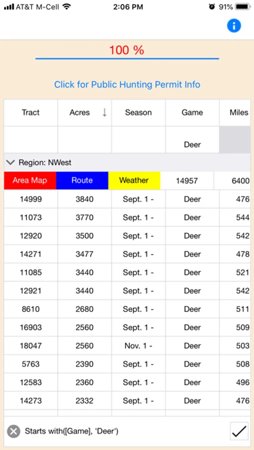 The app provides streamlined views to find what game is available, how many acres the tract contains, and how many miles "as the crow flies" the hunting tract is from the user's current location.