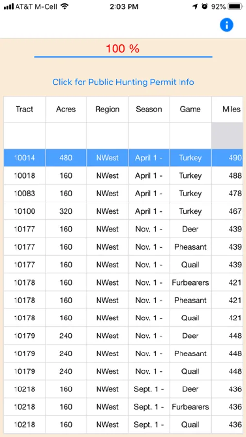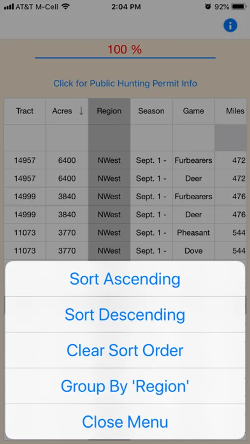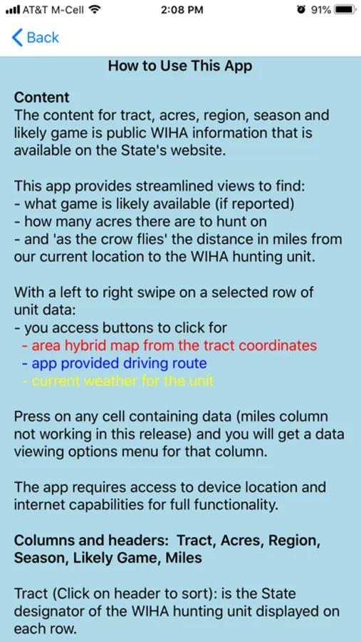 The content for this app is gathered from the State's public hunting resources. The content displayed is the public hunting area or lease, acres, State hunting region and the legal game that is available to hunt in each unit.
