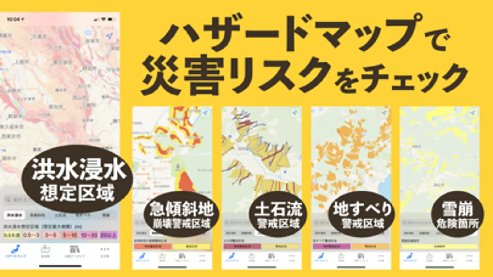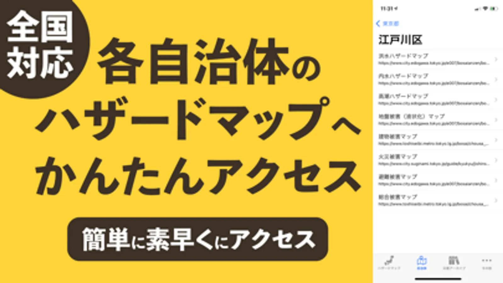 自治体が公開しているハザードマップに簡単に最短でアクセスできます。