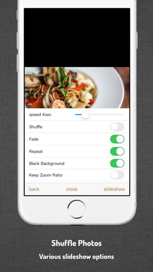 You can enjoy shuffled Slideshow in units of iPhone and iPad camera rolls and albums.
