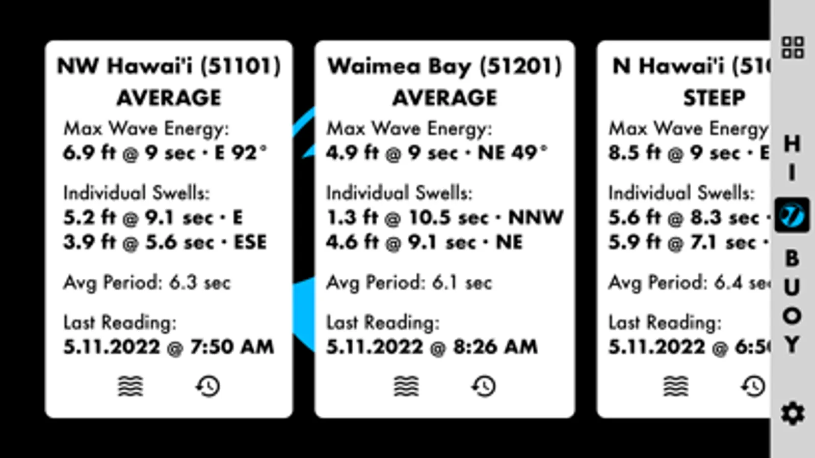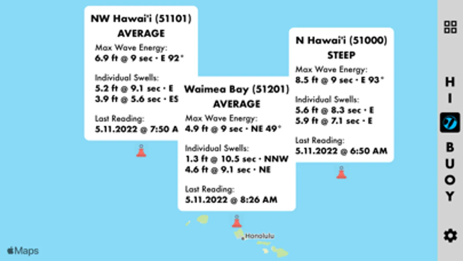 Do you check the wave buoys in Hawai'i? Then this is the app for you. This simple, yet beautiful app displays each buoy's latest data on a map. Now you can check all your favorite buoys at once. You can control which buoys are displayed on the map via the app settings. Tap on a buoy to see the Swell Power Graph for the last 16 hours or the buoy's most recent readings. You can also switch to a list view if the map view isn't for you.