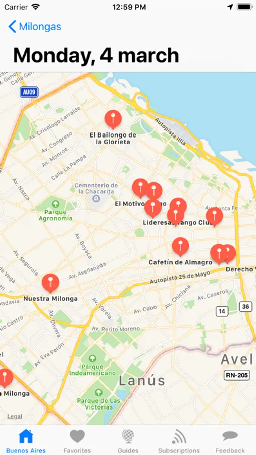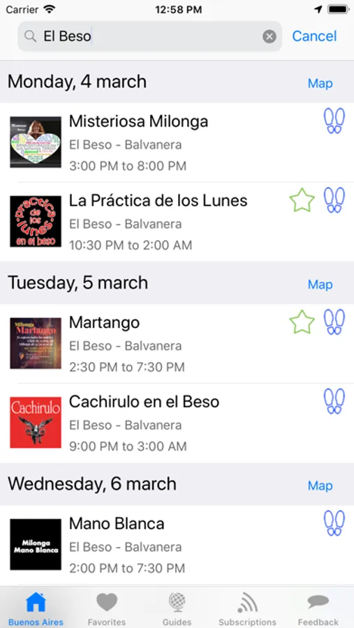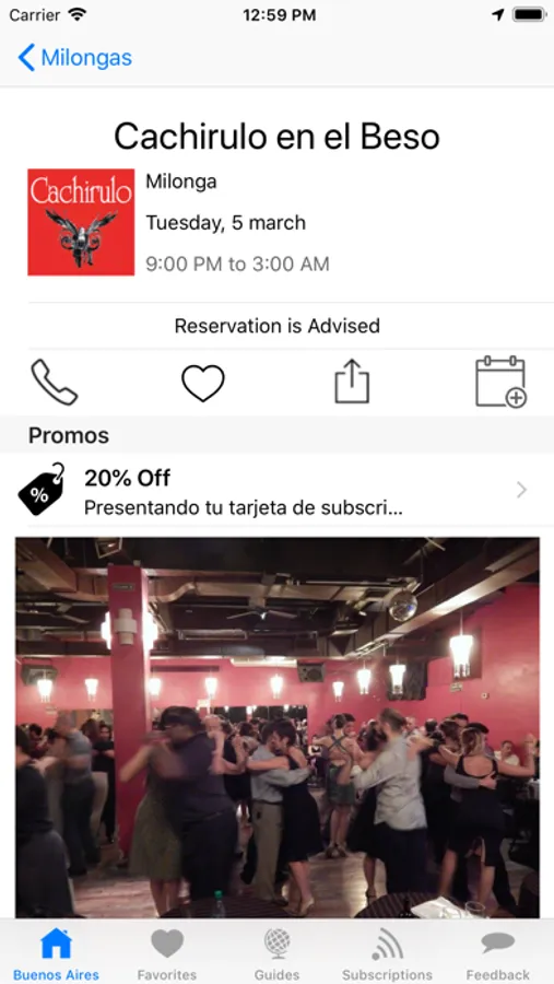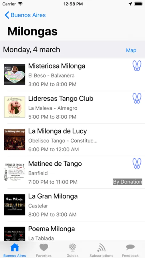 Get up-to-date list of milongas, practicas, pictures of venues, maps, live orchestra performances, classes, etc.