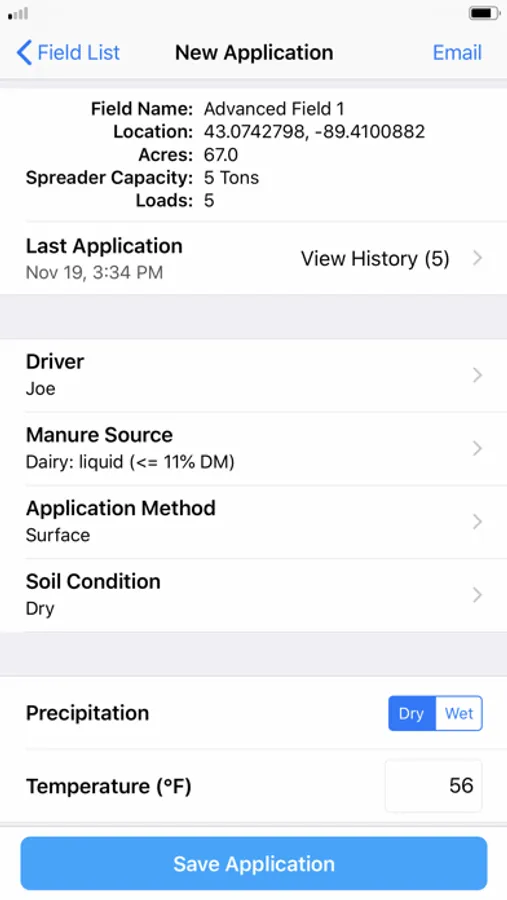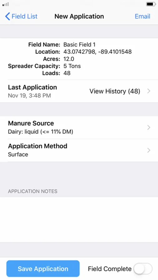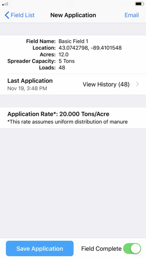 The Manure Tracker app allows you to record manure applications on a field by field basis. By creating a list of field names specific to your farm, each manure application is saved to your smartphone and can be sent as a .csv file to an email address for further record management and safe keeping.