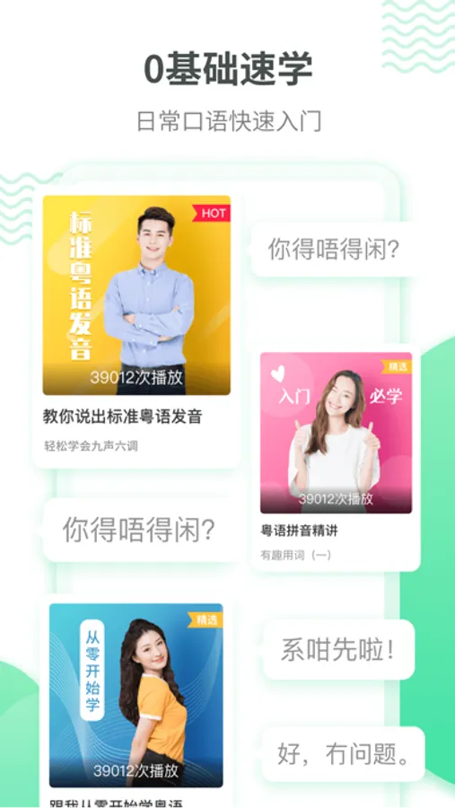 从0基础到常用课程,步步进阶,完善的粤语课程学习体系。阶梯式学习,符合不同基础、不同学习阶段的粤语学习用户。从词汇、对话、测试,每课均设置阶梯学习内容,更有课后测试检测学习效果!