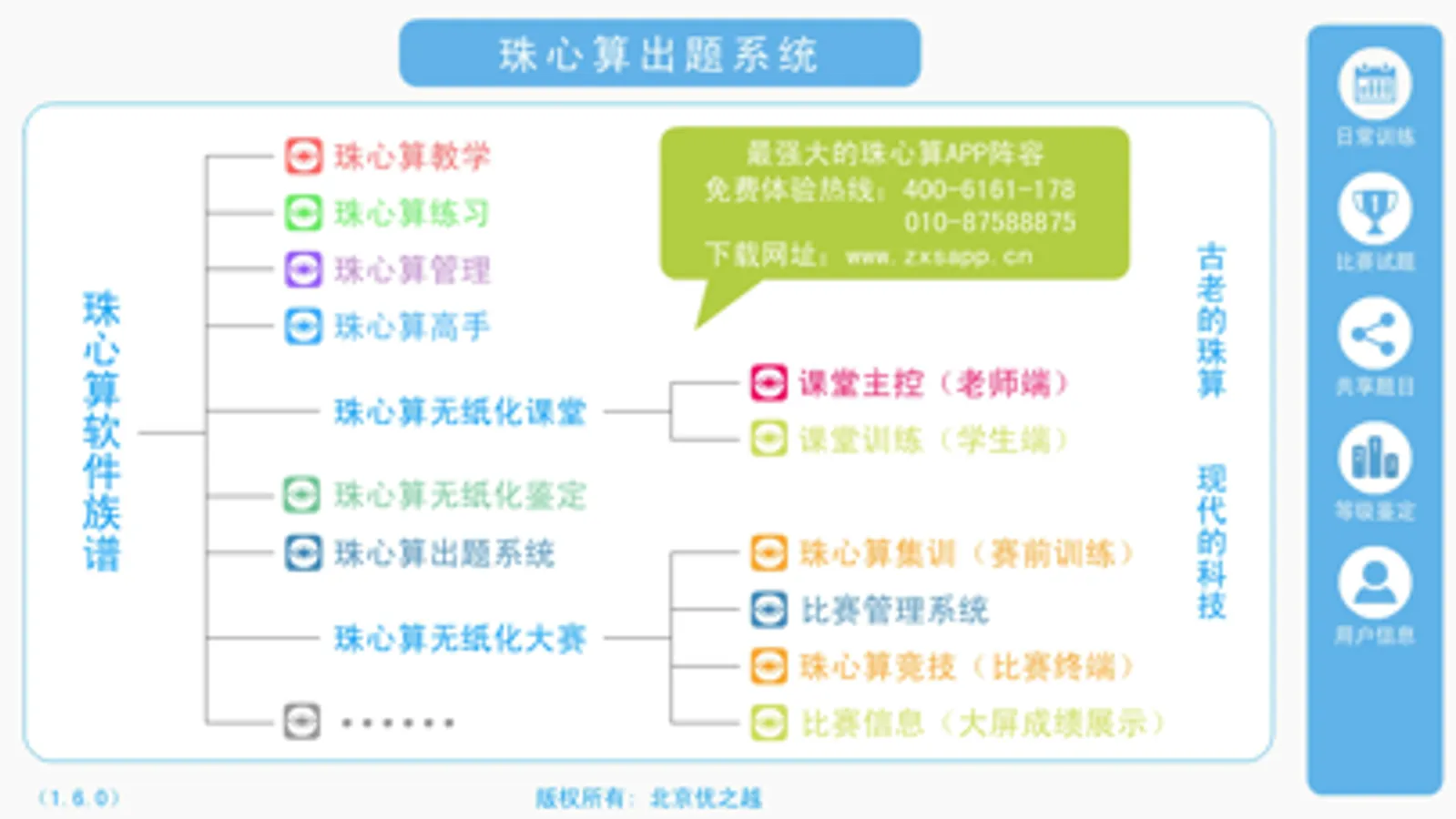 珠心算出题系统是为珠心算行业服务的一款软件,各珠心算老师可以根据自己的需要,灵活设置各种不同的题目,系统自动生成,并进行智能排版。试题打印后,扫一扫上面的二维码即可查看答案。